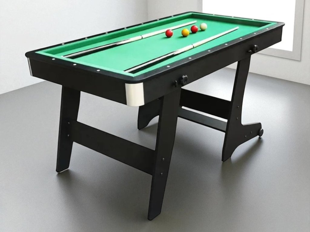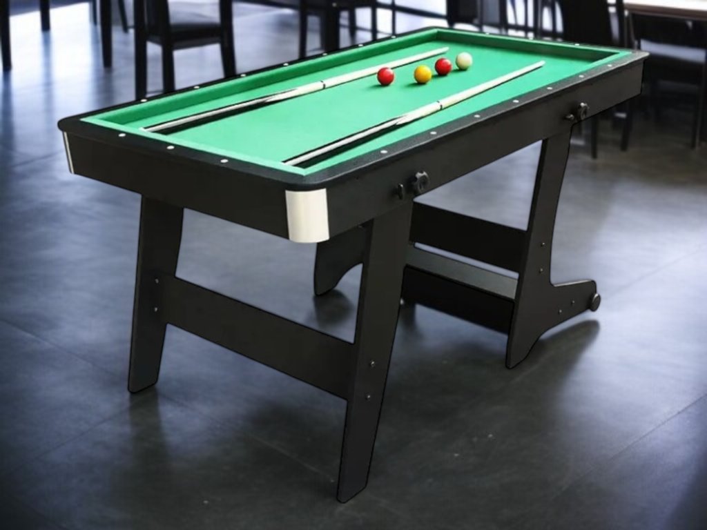 Skladací biliardový stôl s dĺžkou 6 stôp, vyrobený z MDF s PVC laminátom, skladacou zadnou nohou.