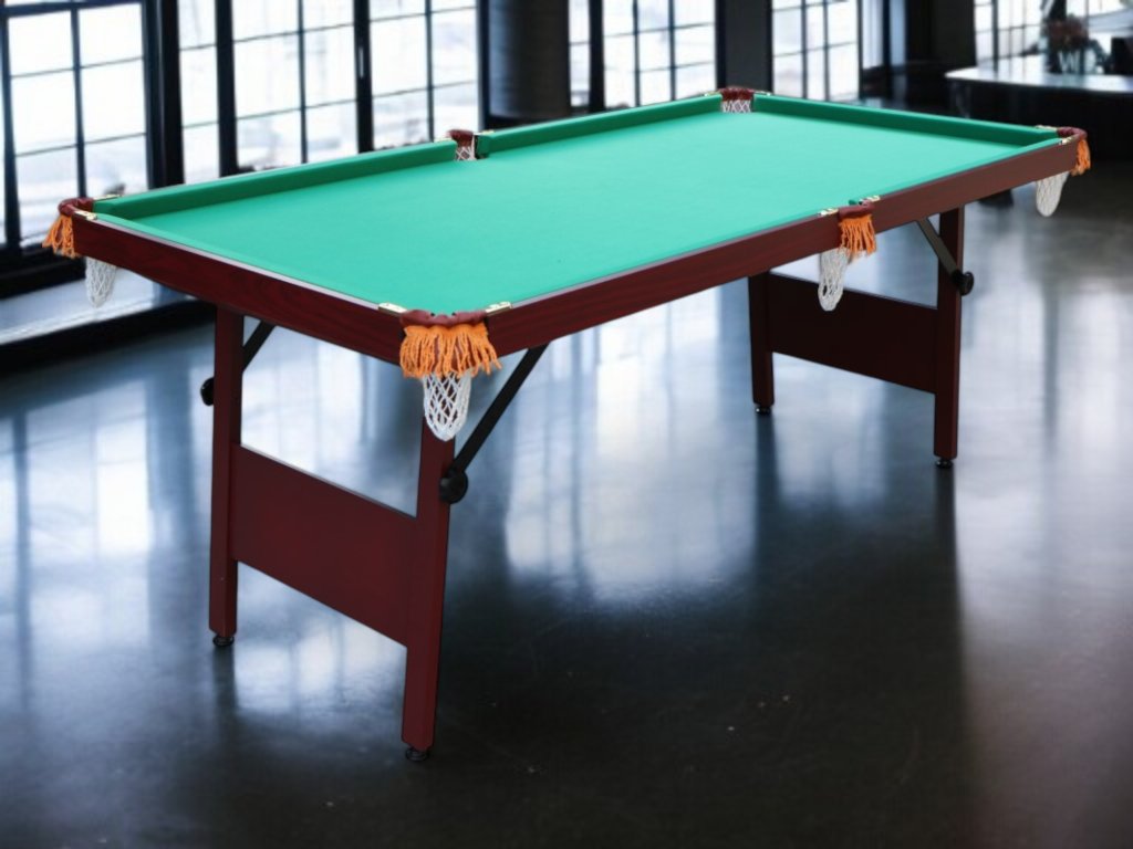 Skladací biliardový stôl s dĺžkou 6 stôp, vyrobený z MDF s PVC laminátom, skladacími nohami pre ušetrenie miesta.