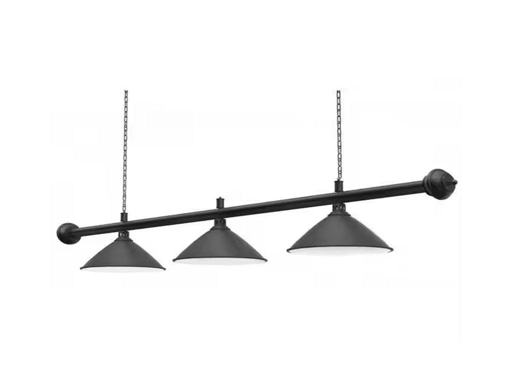 Táto elegantná čierna biliardová lampa s tromi tienidlami ponúka moderný a zároveň profesionálny vzhľad. Kovová konštrukcia s pochrómovanou povrchovou úpravou zaručuje odolnosť a dlhú životnosť. Tienidlá poskytujú rovnomerné osvetlenie celej hracej plochy, zatiaľ čo čierna reťaz umožňuje stabilné zavesenie a úpravu výšky. Lampa je ideálna pre biliardové stoly veľkosti 6 ft, 7 ft a 8 ft – vhodná do herní, klubov aj domácich priestorov.