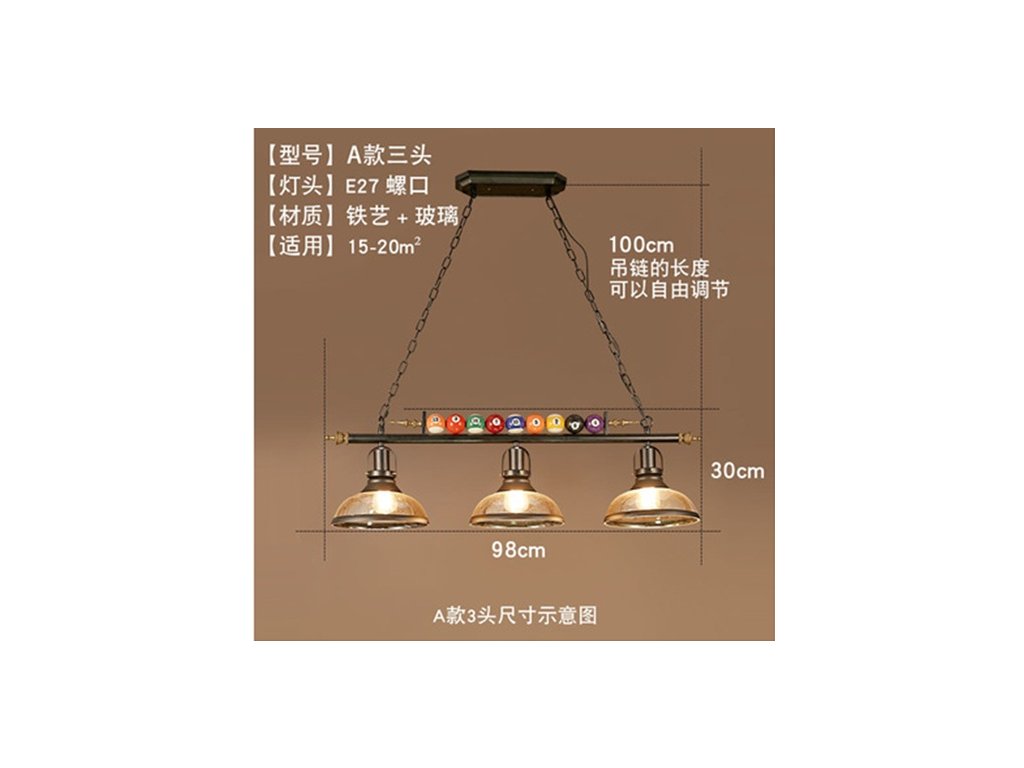 Táto štýlová lampa s troma tienidlami kombinuje kovovú konštrukciu so sklenými tienidlami, ktoré vytvárajú príjemné a rovnomerné osvetlenie hracej plochy. Elegantný dizajn dopĺňa dekoratívna lišta s biliardovými guľami, ktorá podčiarkuje charakter priestoru. Lampa má dĺžku približne 98 cm, čo ju robí ideálnou pre biliardové stoly veľkosti 6 ft a 7 ft. Závesná reťaz umožňuje nastaviť výšku podľa potreby. Vhodná pre domáce herne aj štýlové kluby.