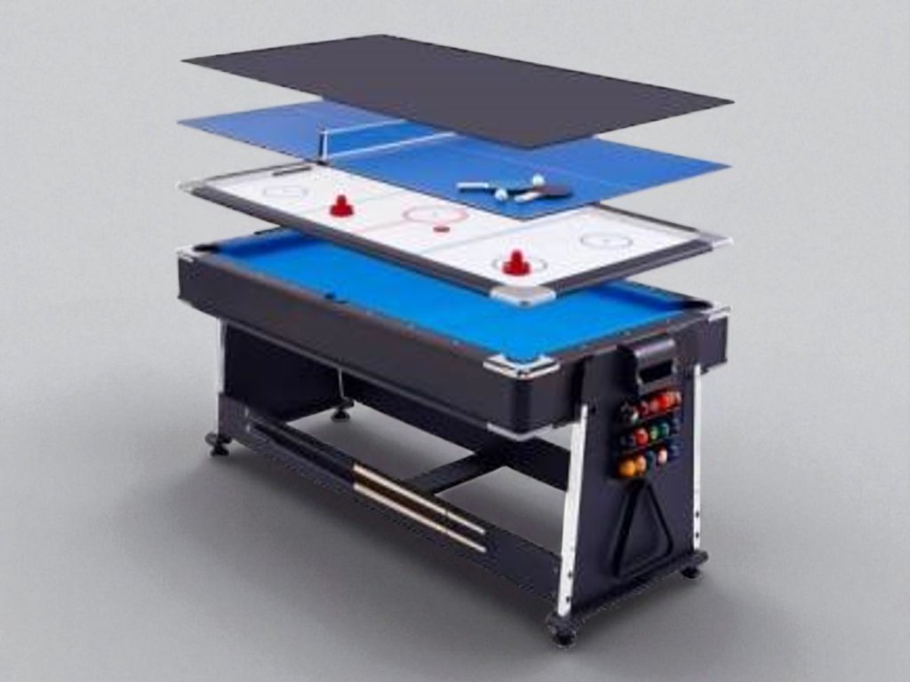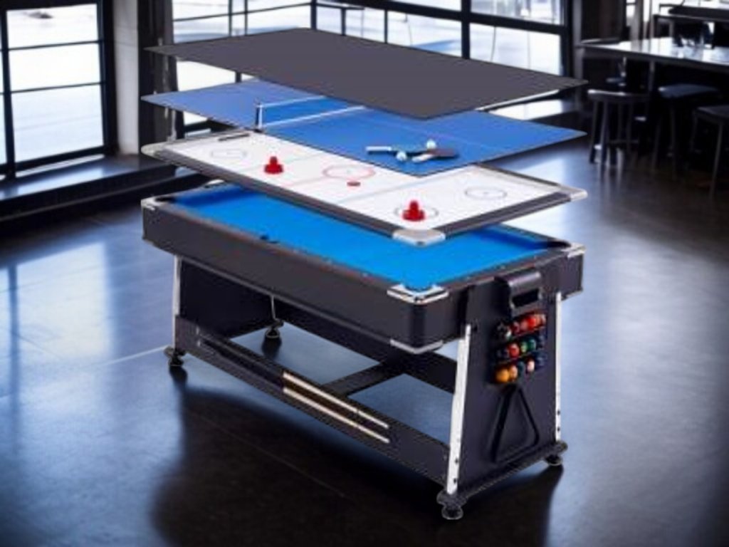 Otočný herný stôl 4 v 1 s dĺžkou 7 stôp. Stôl umožňuje nasledovné hry: biliard, stolný hokej, ping pong a okrem toho je