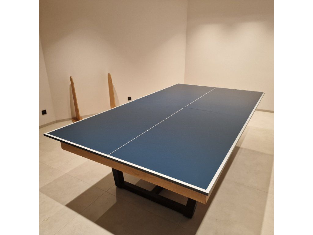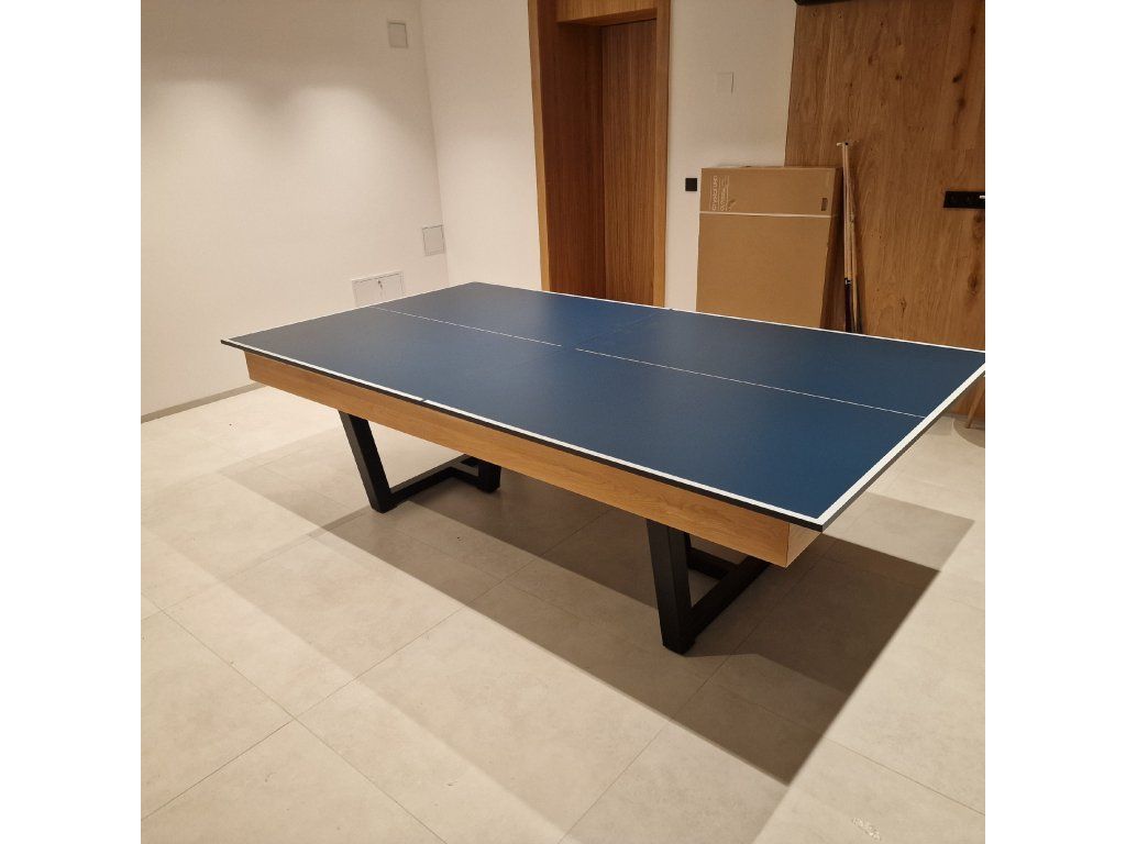 Táto dvojdielna pingpongová doska umožní rýchlo premeniť váš biliardový stôl, vzdušný hokej alebo inú rovnú plochu na plnohodnotný stolnotenisový stôl. Dosky sa predávajú samostatne bez vystužovacích hranolov a spojovacích kolíkov, takže ich stačí iba položiť a môžete začať hrať. Ak však potrebujete pevnejšie spevnenie a prepojenie oboch dielov, môžete si za príplatok 50 € doobjednať úpravu s vystužovacími hranolmi a spojovacími kolíkmi. Doska je pevná, stabilná a pripravená na okamžité použitie.