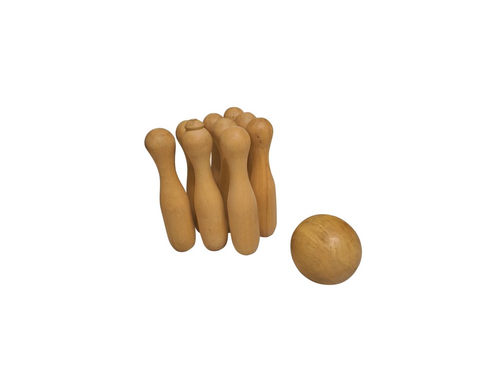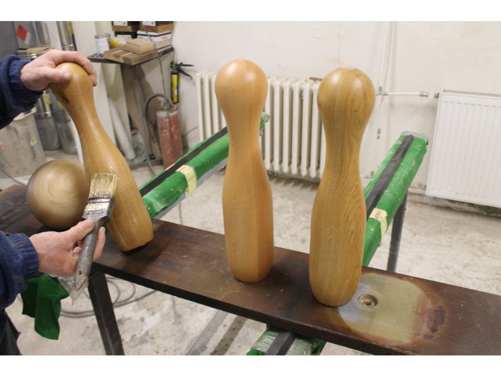 Samostatné ruské kolky 38 cm z masívneho dreva a guľa s priemerom 15 cm ošetrené exteriérovým olejom pre maximálnu odolnosť.